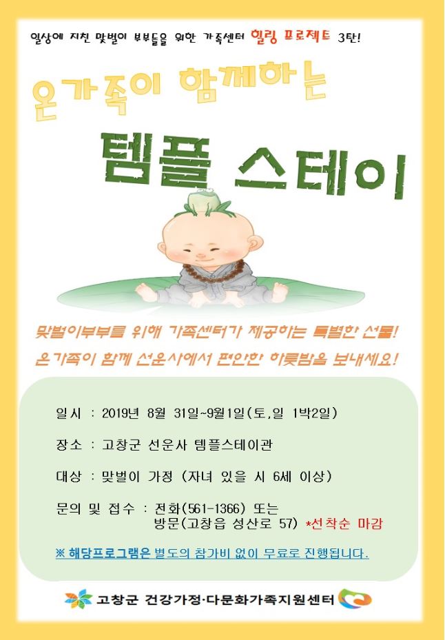선운사 템플스테이 페이지 정보 작성자 관리자 작성일19-07-30 09:37 조회3,897회 댓글0건 이전글 다음글 목록 본문 선운사에서 템플스테이를 운영한다고 합니다. 지친 일상 템플스테이를 이용하여 피로를 푸시는 것도 좋을거 같습니다. 댓글목록 등록된 댓글이 없습니다. 이전글 다음글 목록